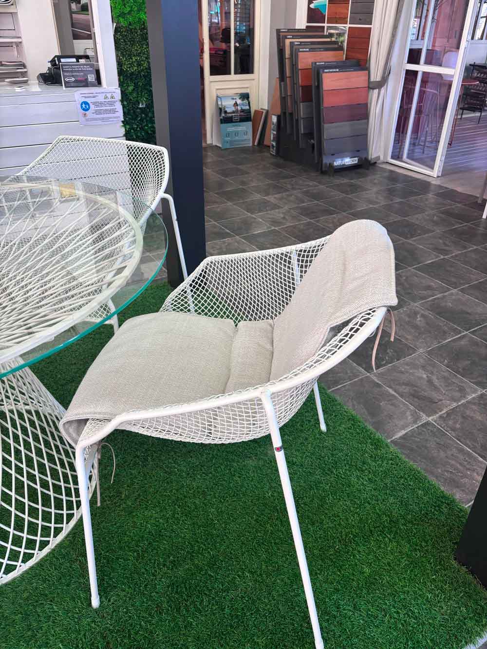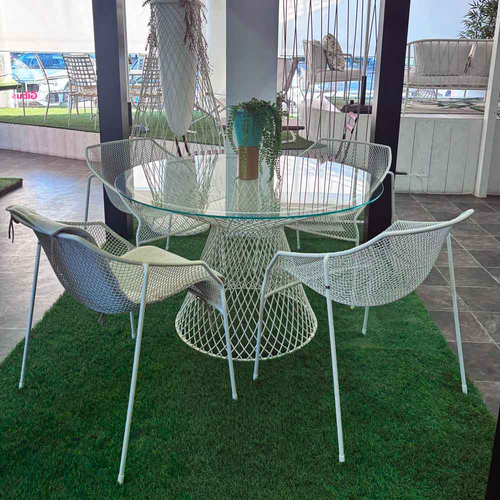Set composto da tavolo modello Heaven con struttura in acciaio zincato colore bianco e piano in vetro temperato trasparente diametro 120 cm. Il set è completato con 4 poltroncine impilabili in rete di acciaio bianco.