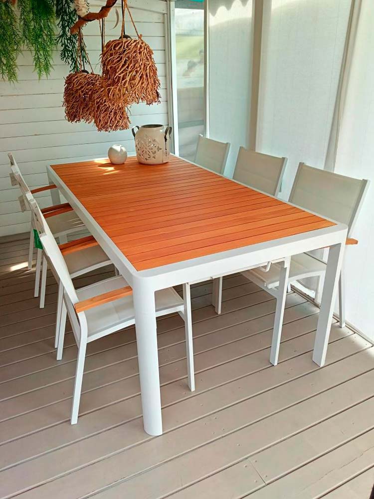 Set pranzo di Moia composto da tavolo TENERIFE in alluminio bianco e teak, allungabile di dimensioni cm 200/300 X 100 e 6 sedie LANZAROTE con seduta e schienale in textilene imbottito avorio e braccioli in teak, impilabili.