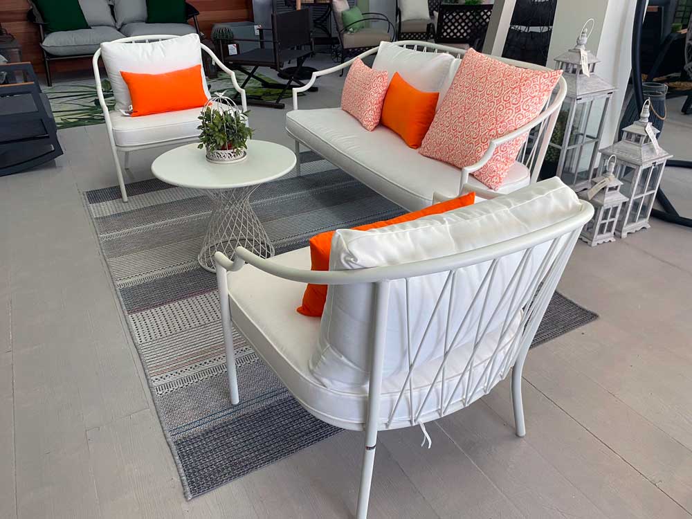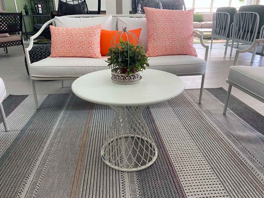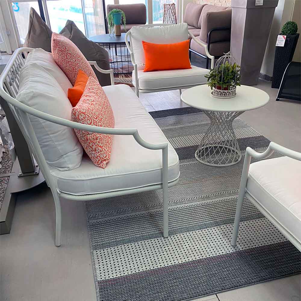 Salotto COMO di Emu con struttura in acciaio zincato e verniciato a polvere in colore bianco, composto da un divano due posti, due poltrone e un tavolino.