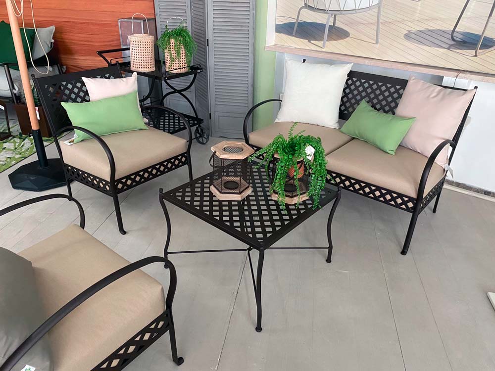 Salotto SPRINGTIME di Vermobil con struttura in acciaio zincato e verniciato a polvere in colore bronzo, composto da un divano due posti, due poltrone e un tavolino. Carrello in acciaio con vassoio asportabile.
