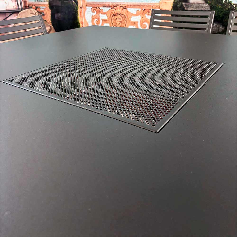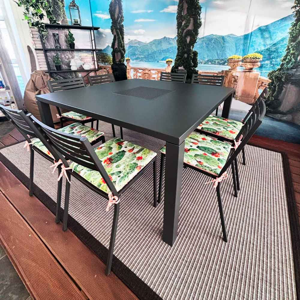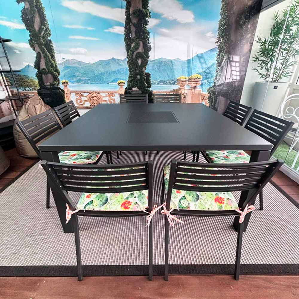 Set pranzo composto da tavolo modelo Quadro in acciaio zincato e verciato colore grigio antracite con inserto centrale in rete di acciaio. Dimensione tavolo centimetri 140 x 140. Al tavolo sono abbinate otto sedie modello segno in acciaio zincato colore antracite impilabili.