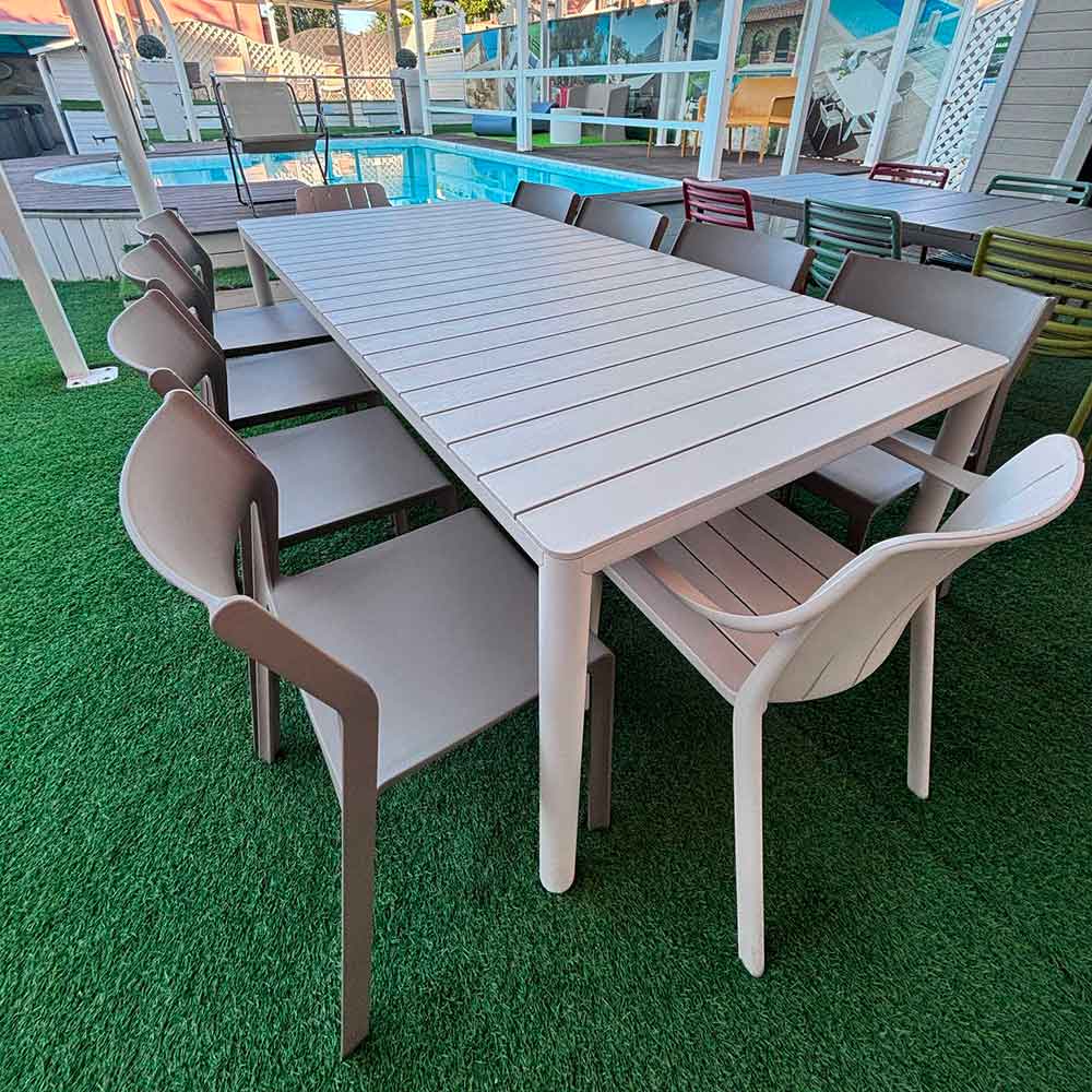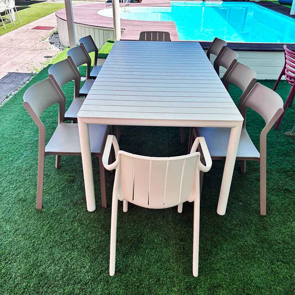 Set composto da tavolo Tevere allungabile con struttura in alluminio colore corda e piano in resina a doghe dimensione cm 100 x 211/275. Il set è completato da otto sedie modello Trill impilabile colore tortora e due poltrone con bracciolo impilabile modello Tiberina colore corda.