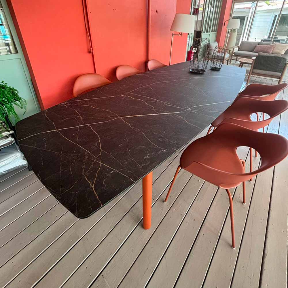 Set pranzo composto da tavolo fisso modello Squid dalle grandi dimensioni con struttura in alluminio color ruggine e piano gress effetto marmo nero. Dimensione tavolo centimetri 300 x 130. Al tavolo sono abbinate sei poltroncine con struttura in acciaio zincato e schienale in resina colore ruggine modello Lady.